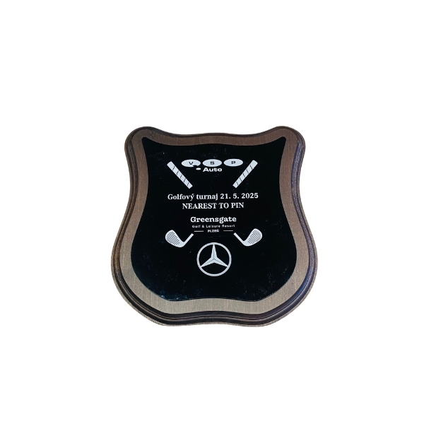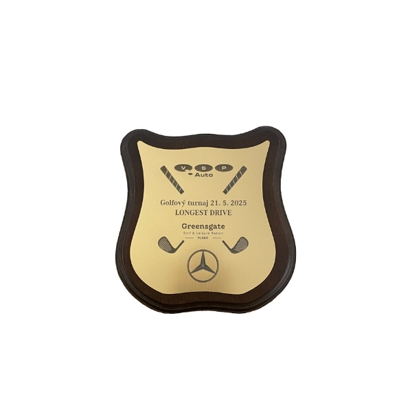 Masivní lipová frézovaná deska ve tvaru erbu. Ve středu desky je umístěn pokovený plast, na který se aplikuje laserové gravírování. Vrchní strana erbu tmavě hnědá, pokovený plast ve variantě bronz – stříbro – zlato. Taktéž provedení na černý nebo bílý akryl.