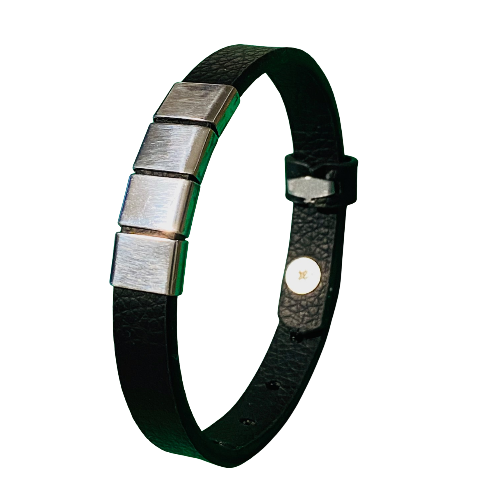 Unisex náramek s maximálně čtyřmi nerezovými poli. Vyroben z PU kůže, maximální obvod 21 cm. Na každý segment lze vygravírovat jedno jméno. Cena je uvedena za náramek se čtyřmi nerezovými poli bez gravírování.